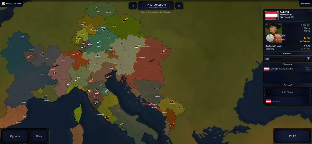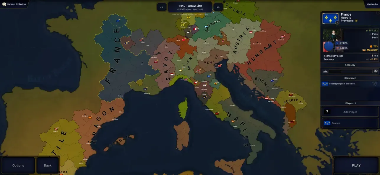 《文明时代2 Age of History II Lite》是一个简单易学但难以掌握的大型战略游戏,该版本为精简体验版,并非完整版。你的目标是使用军事战术和狡猾的外交手段来统一世界,或征服世界。世界会血流成河还是在你面前屈服?任你选择。